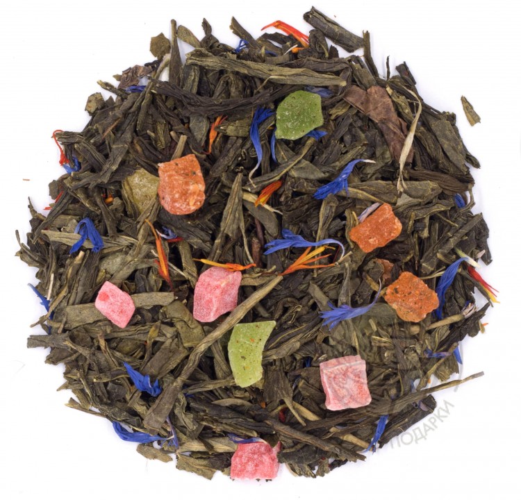 Зеленый чай Мишки Гамми – это оригинальный фруктово-ягодный вкус результат сочетания пряного зеленого чая сорта Сенча, кусочков ананаса, клубники и ягод красной смородины, объединенных в притягательный коктейль с лепестками синего василька и сафлора.